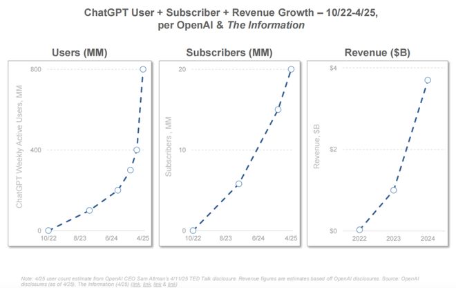 AI 带来的变化是前所未有的,ChatGPT 短短 2 个月内突破 1 亿用户,17 个月后月活跃用户达到 8 亿,订阅用户超 2000 万,年收入接近 40 亿美元。
