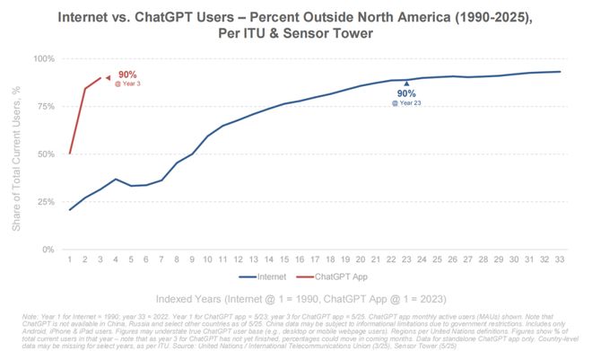 与互联网前期是以美国为中心的技术有所不同,ChatGPT 在短短的三年之后,北美之外的用户普及率就超过 90%,呈现「同步爆发、全球铺开」等技术特征。