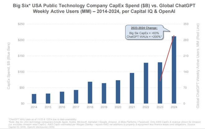 数据显示,这六家公司大举投资 AI 基础设施,如数据中心,2024 年已达 2120 亿美元,同比上涨 63%,为十年内最高。