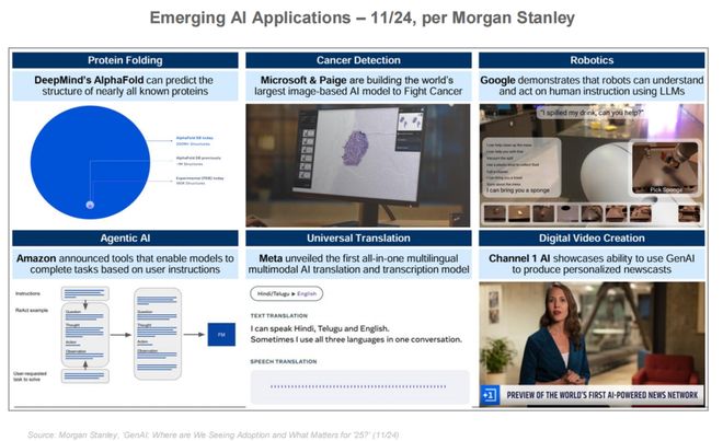 另外,AI 应用也加速渗透到多个领域:蛋白质折叠预测、癌症检测、机器人、多语翻译、视频生成……正在重塑行业生态和人类工作方式。某种程度上说,AI 就是新基建的重要驱动力。