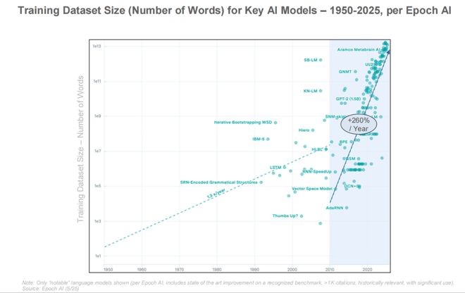 根据 Epoch AI 的数据,从 1950 到 2025 年,AI 模型训练所需数据集从百万词级跃升至万亿词级,规模年增 260%。