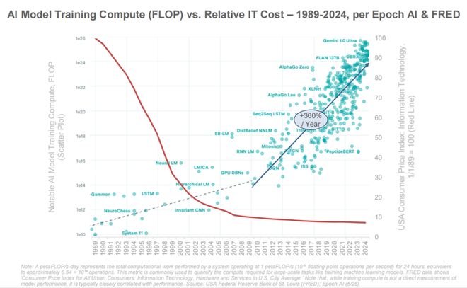 与此同时,所需算力也在大幅增长。虽然 IT 硬件成本持续下降,但模型训练 FLOP(浮点运算)年增长率高达 360%,AI 模型越来越「烧钱」「烧电」「烧卡」。