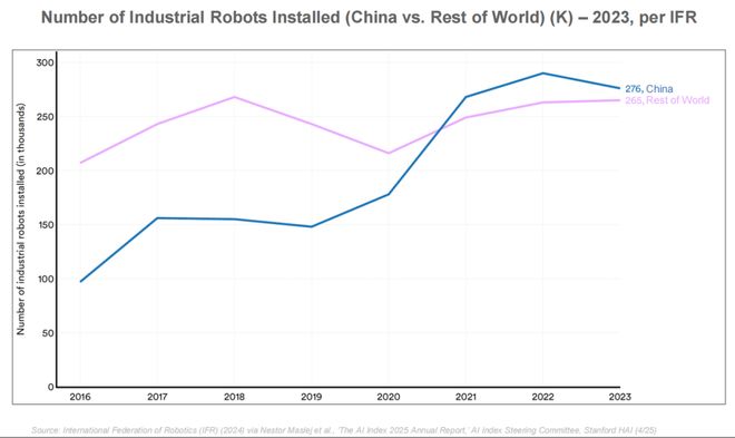 对比来看,中国在工业机器人部署上具备领先优势。2023 年工业机器人安装数量达到 276000 台,首次超过全球其他国家总和。