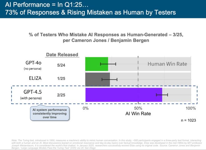 现如今,GPT-4.5 在图灵测试中被 73% 的测试者误认为人类,远超 GPT-4o 和机器人 ELIZA。