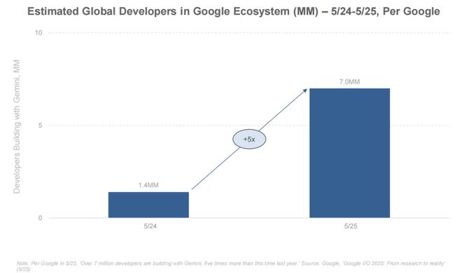 包括在刚过去不久的 Google I/O 大会上,使用 Google Gemini 构建应用的注册开发者总量也从 140 万增长至 700 万,年增幅达 5 倍。