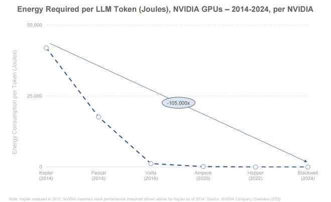 2014 到 2024 十年间,英伟达 GPU 推理单个 Token 所需的能耗下降了约 105000 倍,几乎趋近于可忽略的边际能耗,有利于规模化部署和开发者接入。