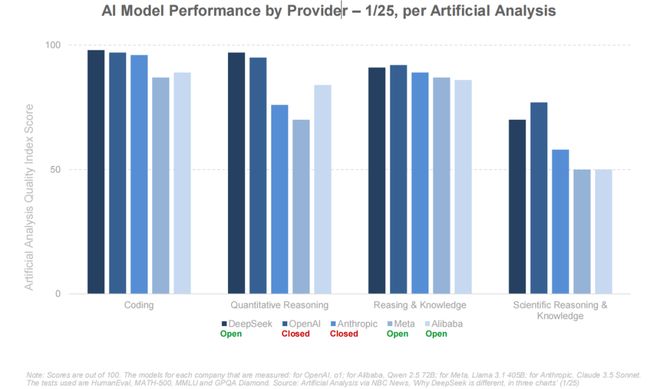 知名分析机构 Artificial Analysis 数据显示,截至 2025 年1 月份,像 DeepSeek、Meta 的 Llama 3、阿里的 Qwen 系列这样的开源模型,已经在推理能力和编程能力等方面的性能逼近闭源模型。