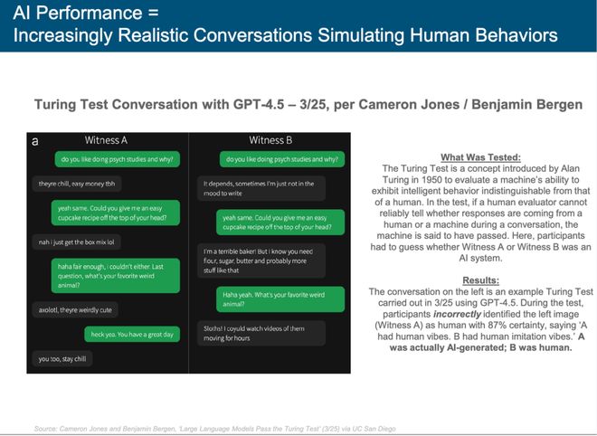 AI 在蛋白质折叠、癌症检测、机器人技术、多语翻译等领域发展迅速,在图灵测试中的表现已超越多数人类测试者,并开始渗透到自动驾驶、机器人等物理世界。