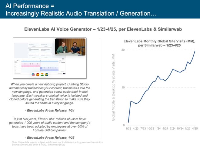 数据显示,ElevenLabs 网站的月访问量从 0 飙升到接近 2000 万,音色克隆+实时翻译已趋近商用级别。龙8登录
