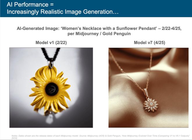 图像方面的进步在 Midjourney v1-v7 上展现得淋漓尽致,2022 年生成的葵花吊坠质感粗糙,肉眼可见地像玩具,到了 v7 版本,质感直接迈向商品级水平。