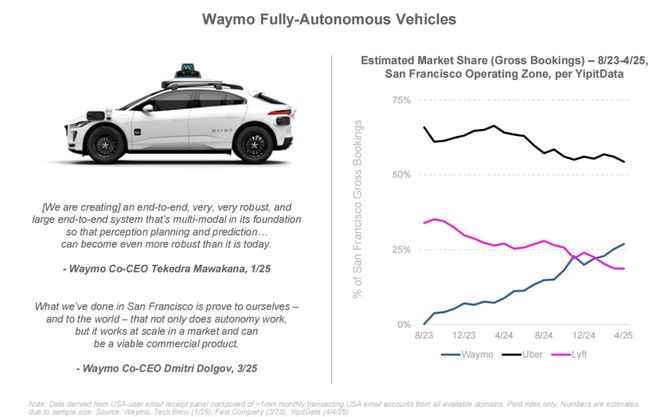 例如,Waymo 和 Tesla 的自动驾驶系统已投入商业运营,不再只是停留在测试阶段,而是与实时环境紧密结合,截止至 2025 年 4 月,Waymo 自动驾驶出租车在旧金山的市场份额已经占到了约 1/3。