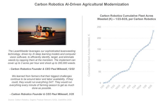 与此同时,AI 正在快速渗透到各个行业,包括 AI 工厂、AI 机器人、工业 AI、AI 医疗设备与 AI 农业等部署,正在去取代传统的人工流程。如 Carbon Robotics 等农业公司则将 AI 应用于除草,通过计算机视觉实现无农药作业。