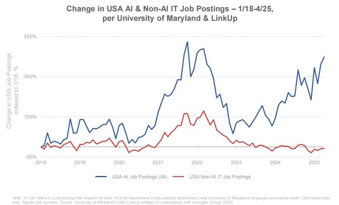 AI 相关岗位增长 +448%,非 AI 岗位反降 -9%(2018–2025),说明企业对于 AI、机器学习、数据科学、生成式 AI 等相关岗位需求迅猛增长;而传统 IT 岗位(如基础运维、通用编程)职位需求则相对饱和甚至萎缩。