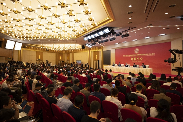 参加中国人民抗日战争暨世界反法西斯战争胜利80周年纪念活动记者招待会的中外记者现场阅读《习谈治国理政》第五卷